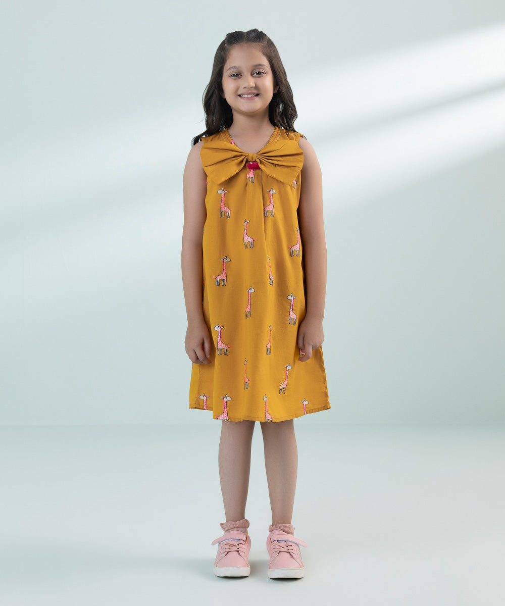 Make your little one stand out with our mustard all-over embroidered A-line dress featuring a fabric bow at the front.