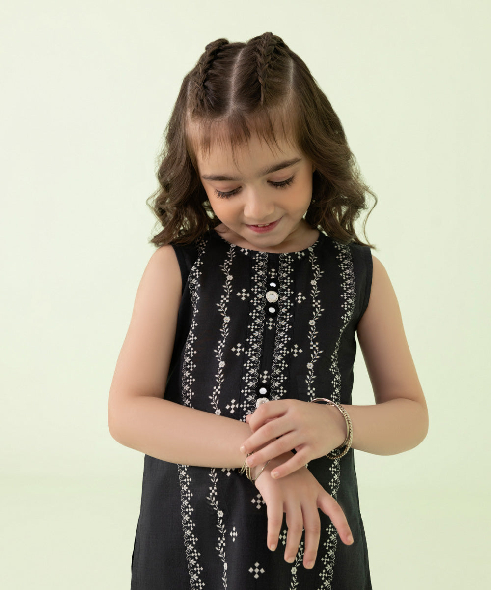 Dress your little one in black straight round neck shirt with mirror embellishments paired with straight pants.