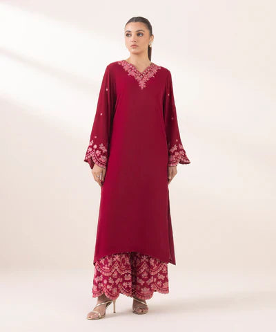 Make a statement with our bright red two-piece ensemble featuring an embroidered straight velvet shirt with a V-neckline paired with scalloped flared pants.