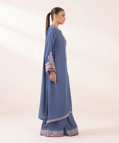 Make a statement with our steel blue embroidered straight shirt with tilla embroidery and sequins paired with flared pants.