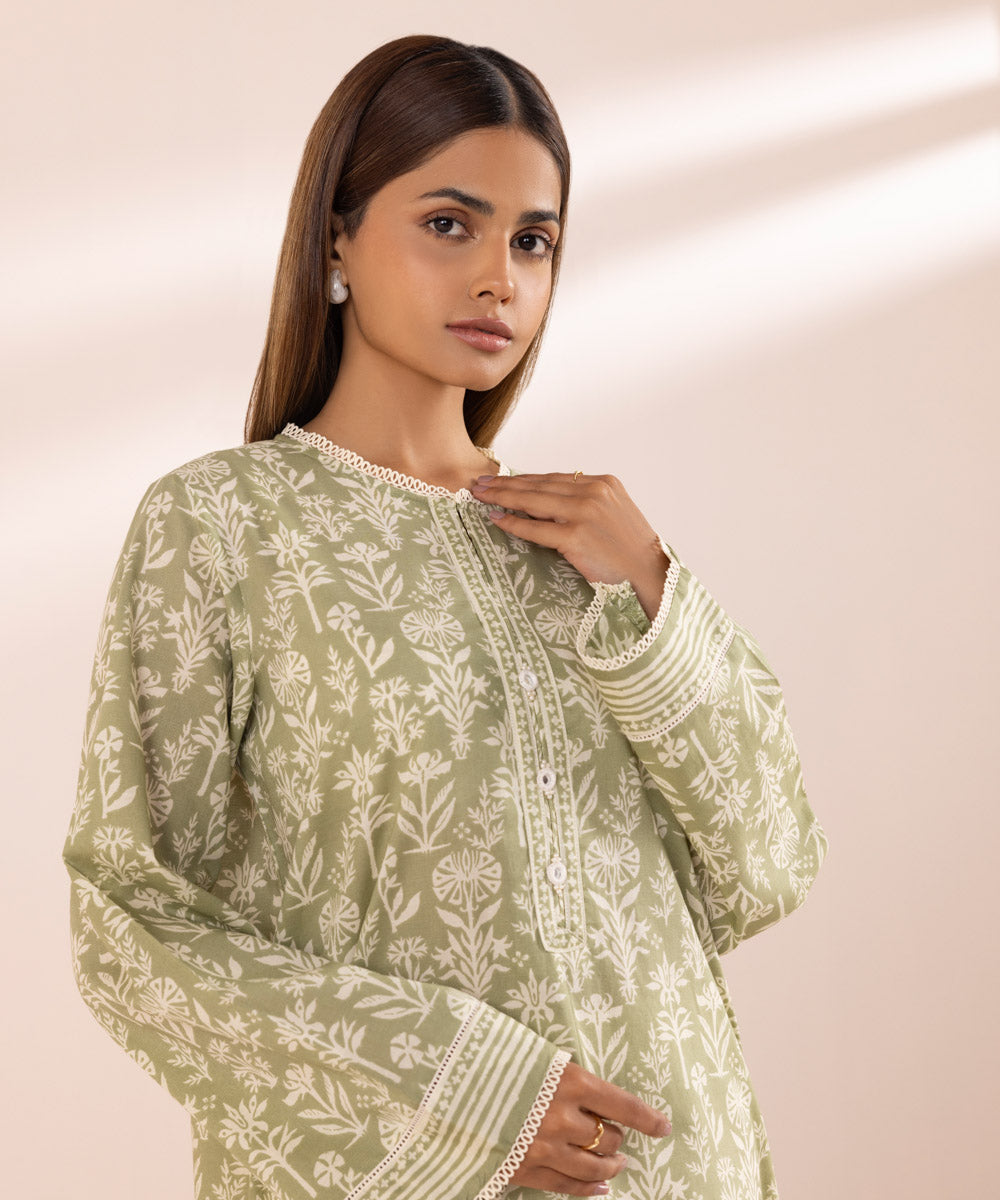 Channel effortless style in our pistachio green, printed textured lawn straight shirt with lace.