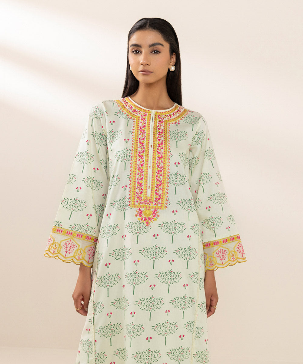 Printed Front with Embroidery & Lace, Printed Back with Embroidery & Lace, Full Sleeves, Round Neckline with a slit