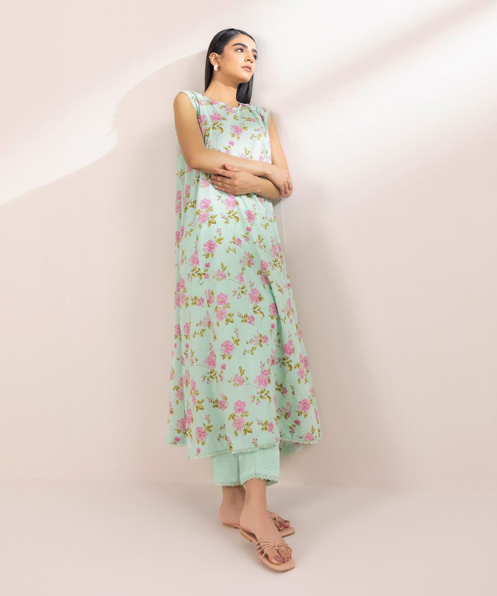 Curate a floral festive look in our printed light blue, long A-line sleeveless textured lawn shirt.