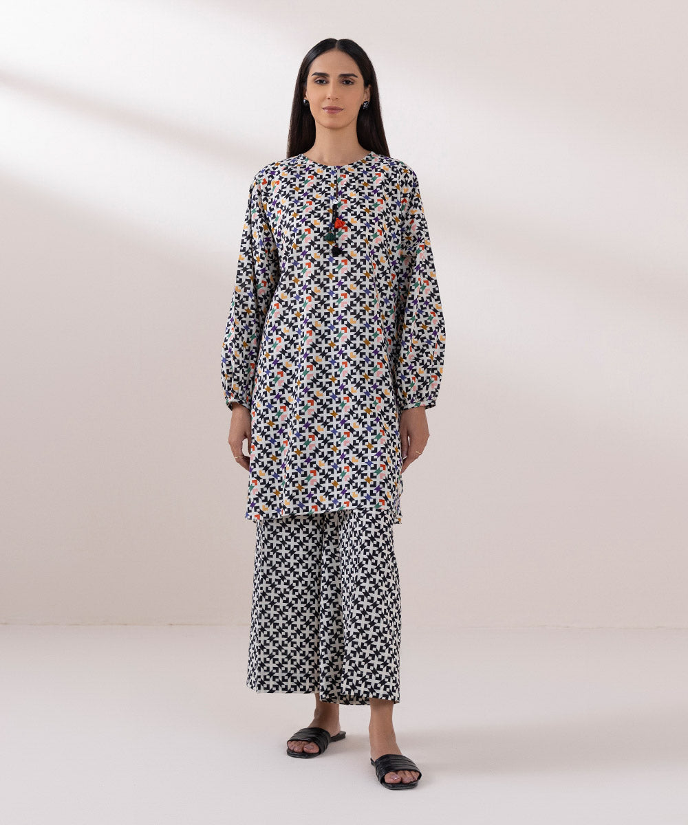Printed Front, Printed Back, Full Sleeves, Round Neckline with a slit & Tassels