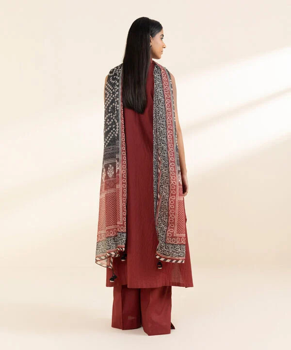 Make a statement with our three-piece ensemble in maroon and black featuring a dyed seersucker shirt and trousers paired with a printed blended tissue dupatta.