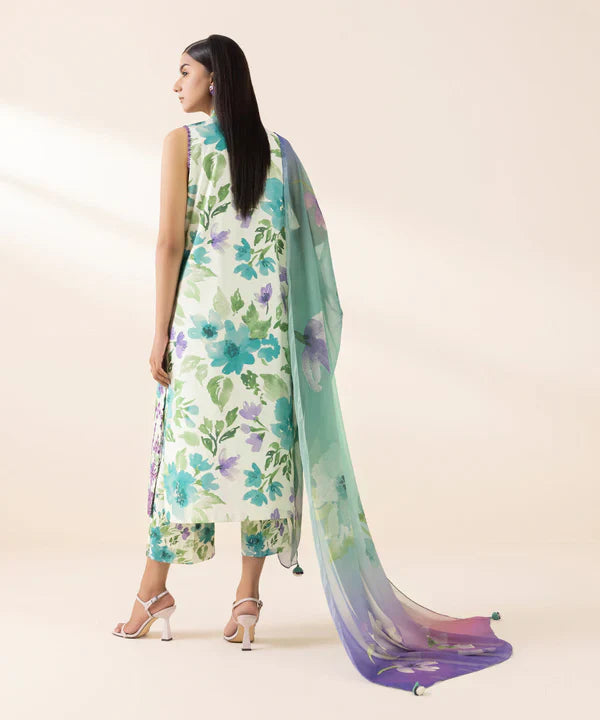 Opt for blooming summer florals with our three-piece embroidered suit in ivory and turquoise featuring a cambric shirt, blended tissue dupatta and cambric trousers.