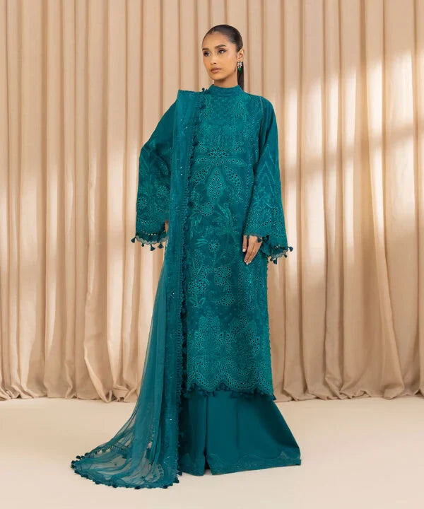 Make a statement with our three-piece embroidered ensemble in teal green featuring a dyed cotton jacquard shirt paired with a blended net dupatta and matching cotton trousers.