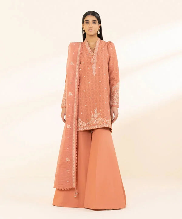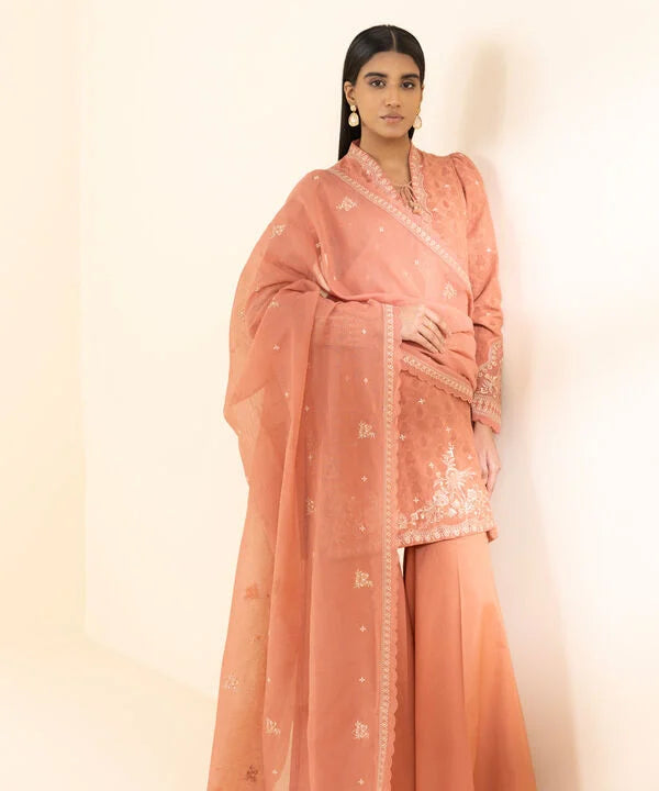 Elevate your festive style with our three-piece embroidered terracotta ensemble featuring a cotton jacquard shirt paired with a blended textured karandi dupatta and cotton trousers.
