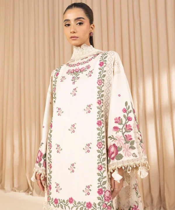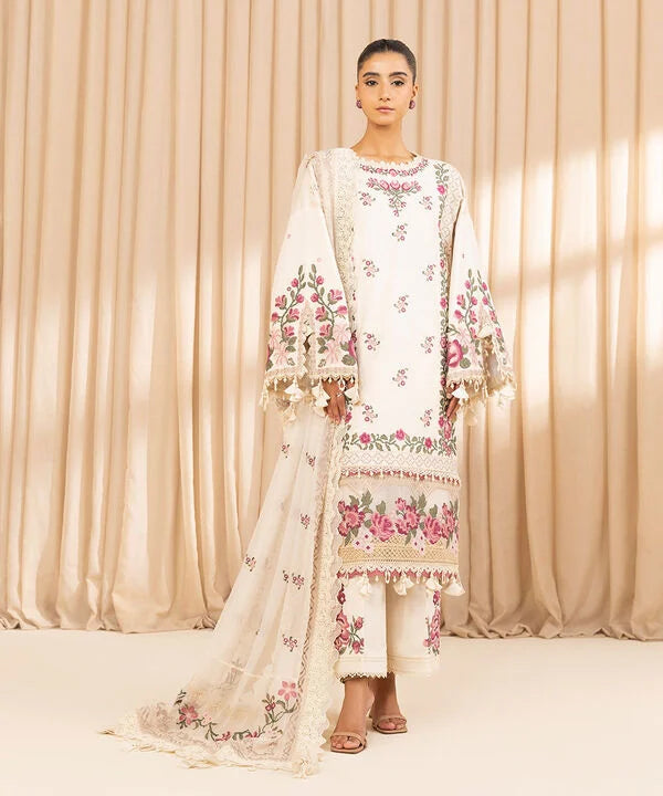 Make a statement with our three-piece embroidered ensemble in off white featuring a dyed fine cotton satin paired with a crinkle chiffon dupatta and dyed cotton trousers.