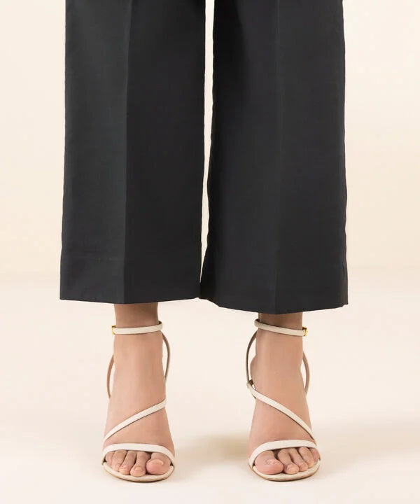 Elevate your style with our three-piece embroidered ensemble in black featuring a crosshatch shirt, cotton trousers and a dyed embroidered blended net dupatta.