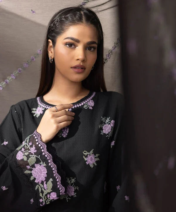 Elevate your style with our three-piece embroidered ensemble in black featuring a dobby shirt, and dyed cotton trousers paired with a matching blended chiffon dupatta.