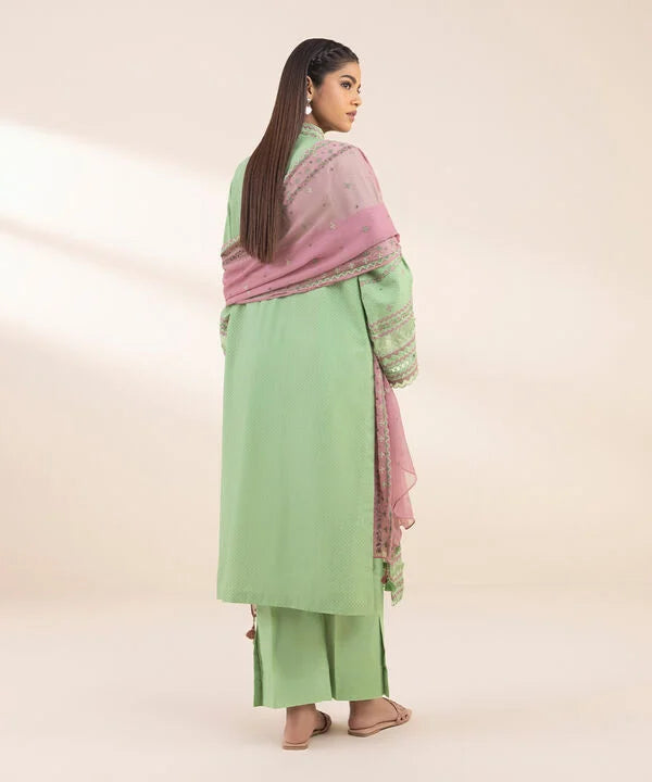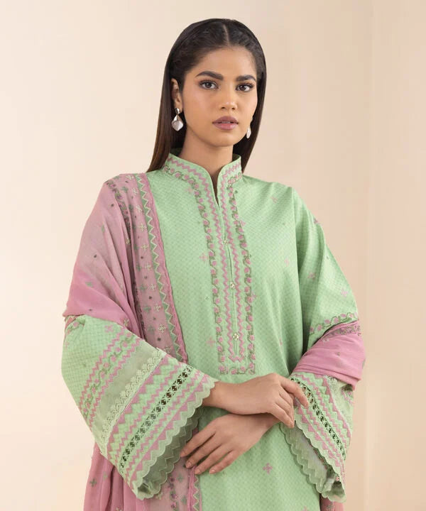 Elevate your style with our three-piece embroidered ensemble in laurel green featuring a dobby shirt, dyed cotton trousers and a pink blended chiffon dupatta.