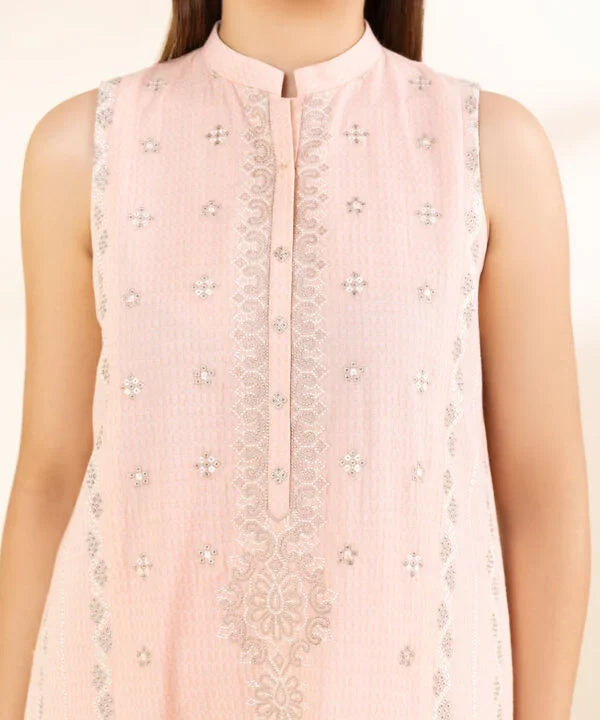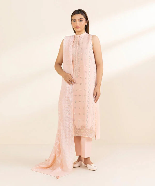Make a statement with our three-piece embroidered ensemble in light pink featuring a dobby shirt, dyed cotton trousers and an extra weft jacquard dupatta.