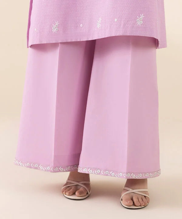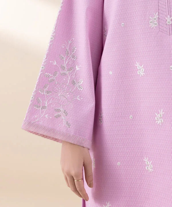 Elevate your style with our three-piece embroidered ensemble in soft lilac featuring a dobby shirt, extra weft jacquard shirt and dyed cotton trousers.