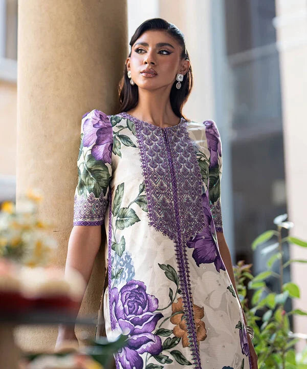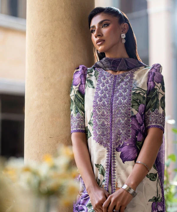 Elevate your style with our three-piece printed ensemble in off white and purple featuring a dobby shirt paired with a crinkle chiffon dupatta and dyed cotton trousers.