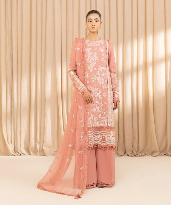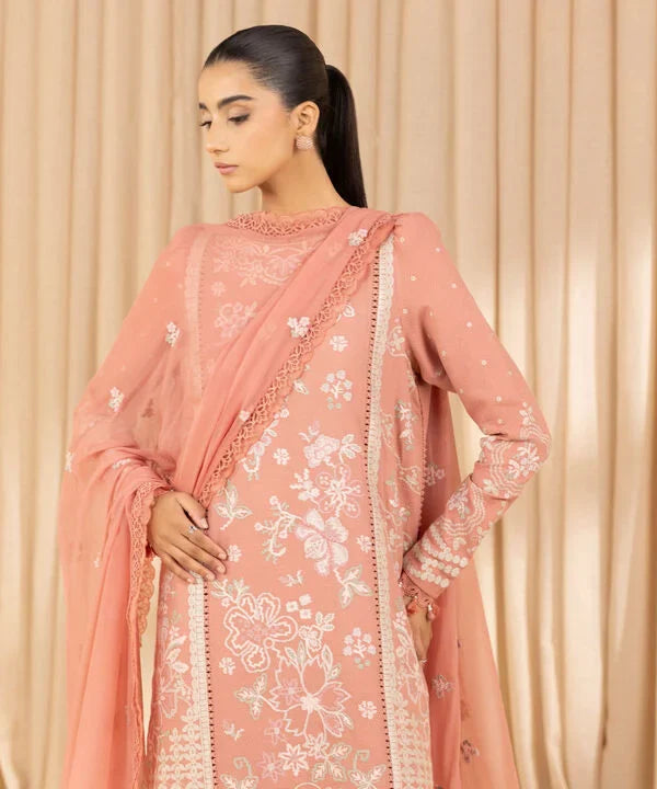 Make a statement with our three-piece embroidered ensemble in peach featuring a dyed dobby shirt paired with a crinkle chiffon dupatta and matching cotton trousers.