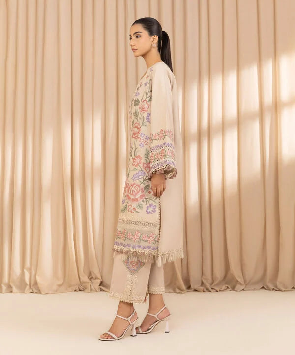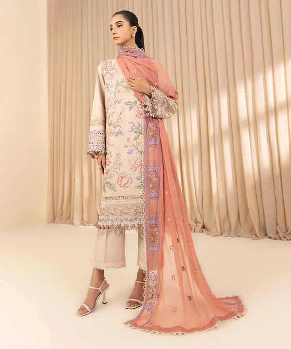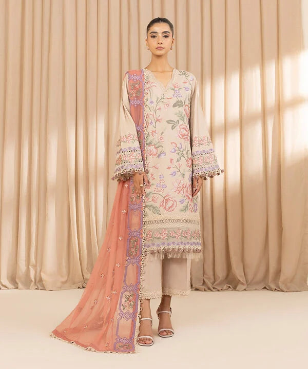 Make a style statement with our three-piece embroidered ensemble in beige featuring a dobby shirt, dyed cotton trousers and a pink crinkle chiffon dupatta.