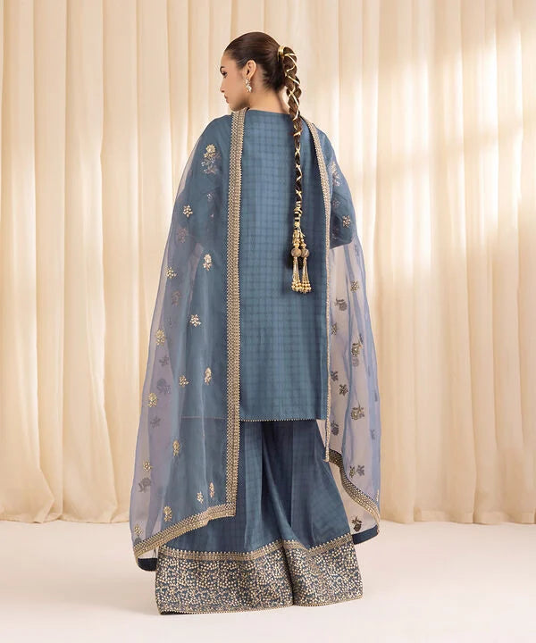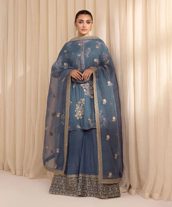 Make a striking statement with our three-piece ensemble in blue featuring an A-line shirt with embroidery paired with matching sharara pants and a blended organza dupatta.