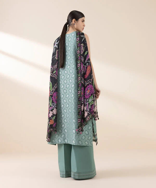 Elevate your style with our three-piece embroidered ensemble featuring an aqua green extra weft jacquard shirt paired with a bemberg tissue dupatta and dyed cotton trousers.