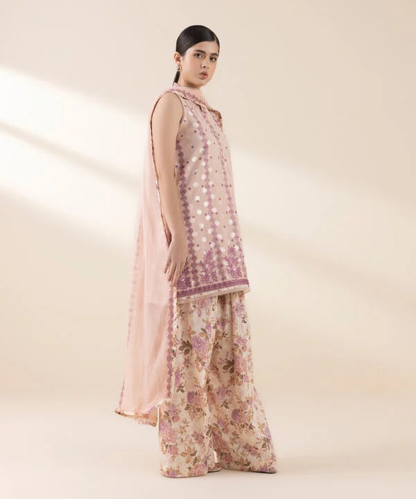 Make a statement with our three-piece embroidered ensemble in light pink featuring an extra weft jacquard shirt paired with a blended chiffon dupatta and cotton trousers.
