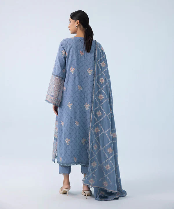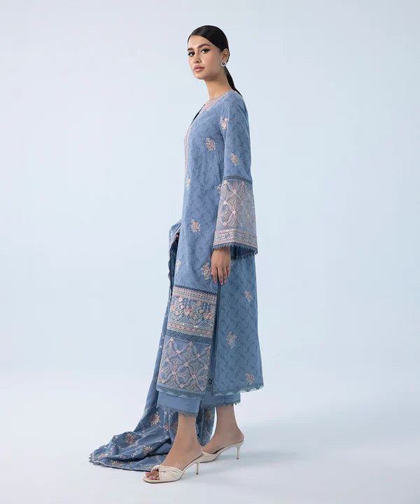 Make a statement in our stone blue three-piece featuring enticing patterns and a karandi dupatta.