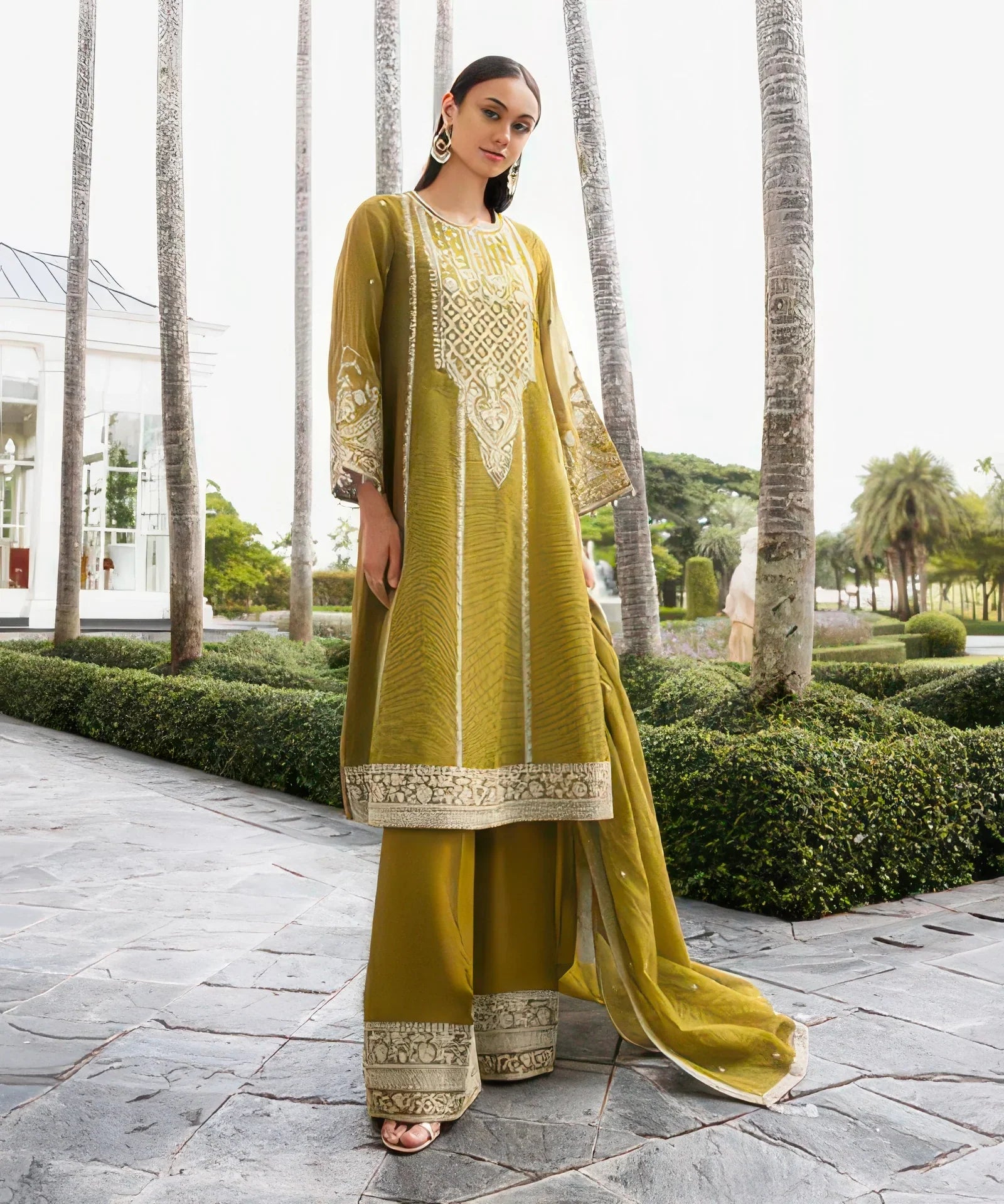 Make the perfect festive statement in our olive yellow embroidered blended textured karandi three-piece suit, featuring a flared A-line shirt, flared pants, and matching dupatta.