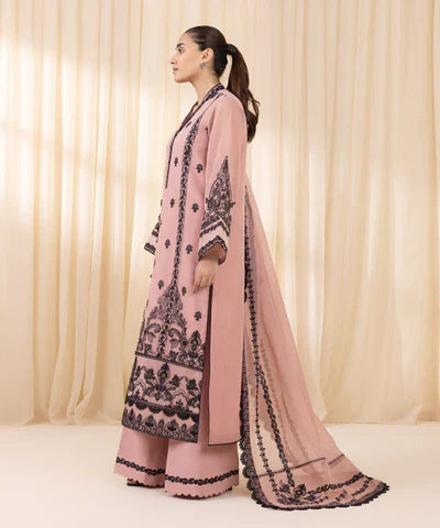 Make a style statement with our embroidered three-piece ensemble in Blush Pink and Black featuring a blended textured karandi shirt paired with dyed raw silk trousers and a textured karandi dupatta.