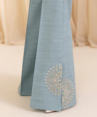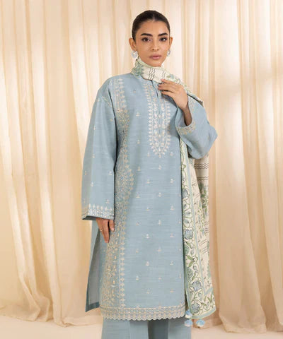 Experience winter warmth in style with our off-white and aqua three-piece embroidered ensemble, featuring a khaddar shirt, dyed trousers, and matching dupatta.