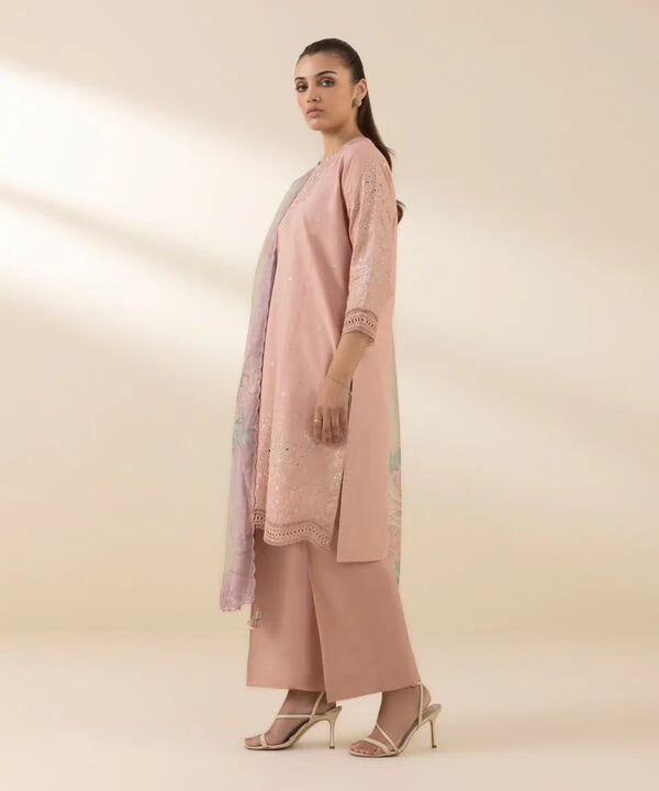Elevate your style with our three-piece embroidered ensemble in peach featuring a lawn shirt, dyed cotton trousers and a multicoloured manar dupatta.