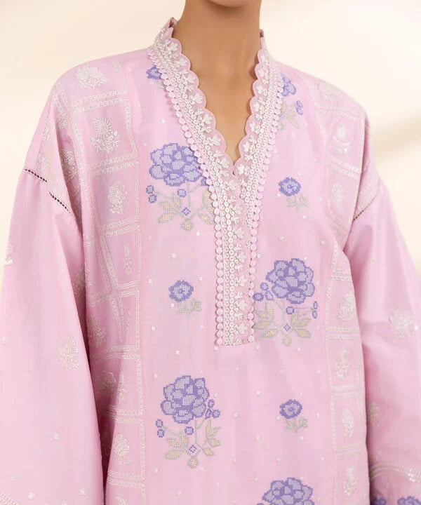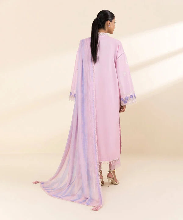 Make a statement with our three-piece embroidered powder pink ensemble featuring a textured lawn shirt paired with a pink and blue bemberg chiffon dupatta and cotton trousers.
