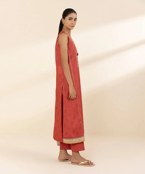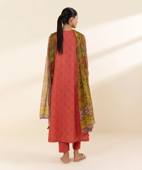 Make a statement with our three-piece embroidered red ensemble featuring a lawn shirt paired with a blended chiffon dupatta and cotton trousers.