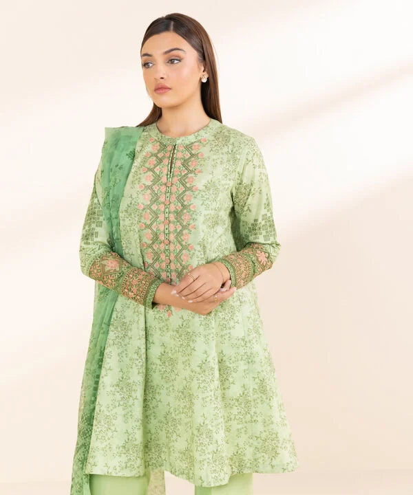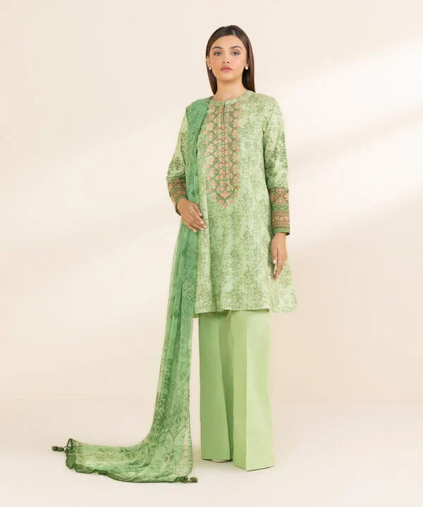 Make a statement with our three-piece embroidered ensemble in pistachio green featuring a lawn shirt, cotton trousers and a blended chiffon dupatta.