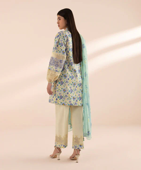Immerse yourself in blooming florals with our off white and blue three-piece embroidered suit featuring a lawn shirt, blended tissue dupatta and cambric pants.