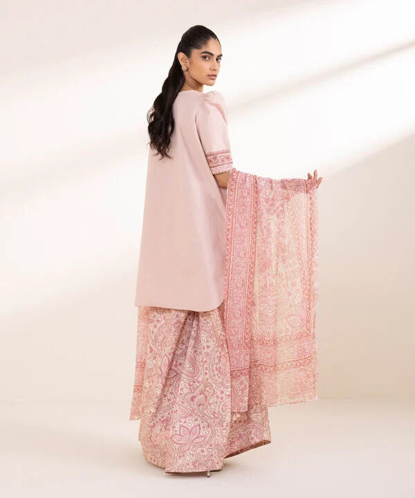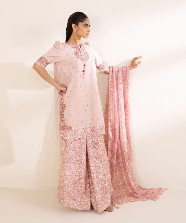 Elevate your style with our three-piece embroidered ensemble in tea pink featuring a textured lawn shirt, blended chiffon dupatta and cotton trousers.