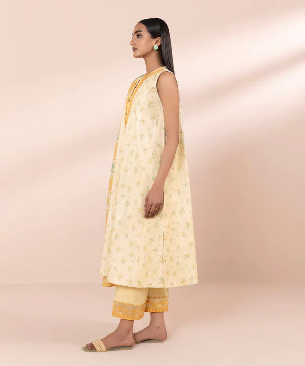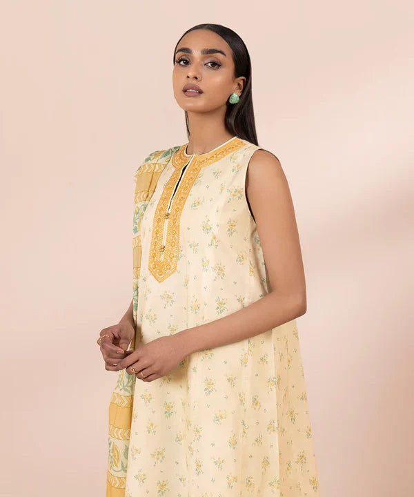 Elevate your summer style with our embroidered ecru-white and off-white three-piece featuring a lawn shirt, cambric trouser, and voile dupatta.