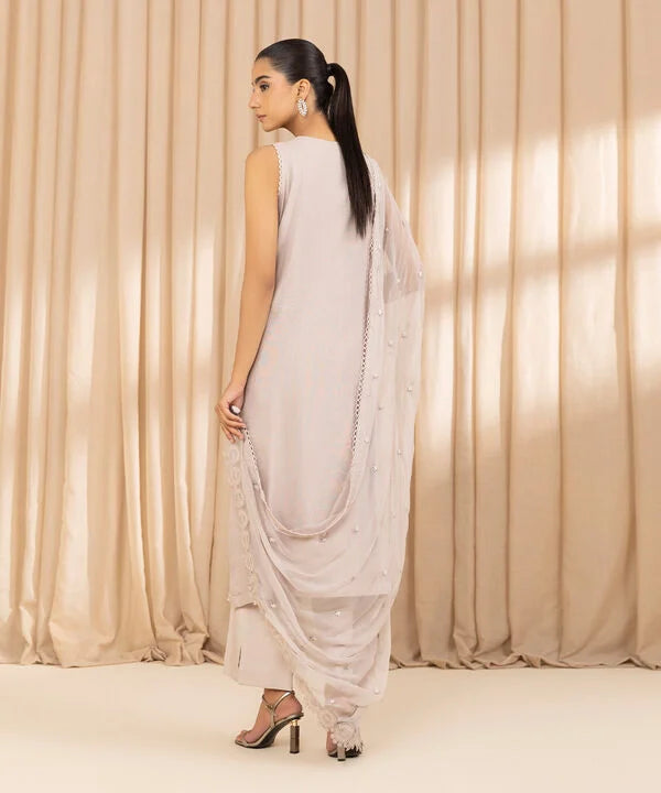 Make a festive statement with our three-piece embroidered ensemble in sand grey featuring a blended khaddi net shirt paired with raw silk trousers and a crinkle chiffon dupatta.