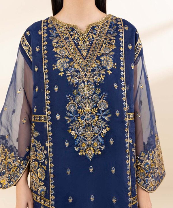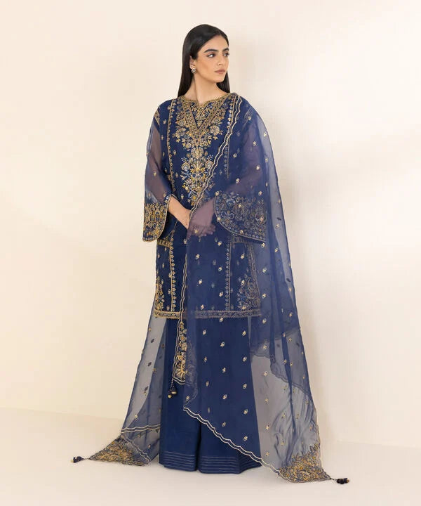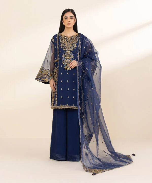 Turn heads this season with our three-piece embroidered ensemble in royal blue featuring a blended organza shirt and dupatta paired with viscose raw silk trousers.