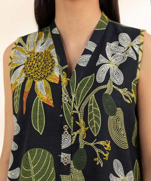 Elevate your style with our three-piece printed khaddar ensemble in black and yellow with an off white dupatta.