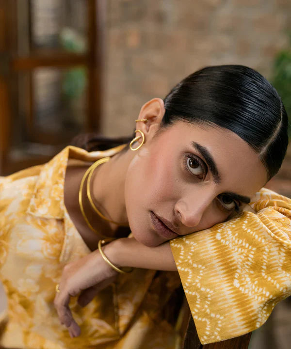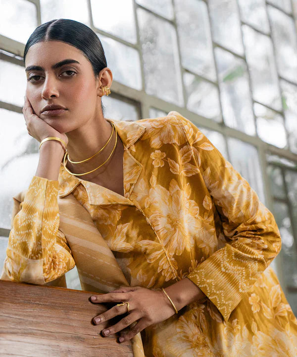 Strut in style in our off white and mustard three-piece featuring abstract patterns paired with a silk dupatta.