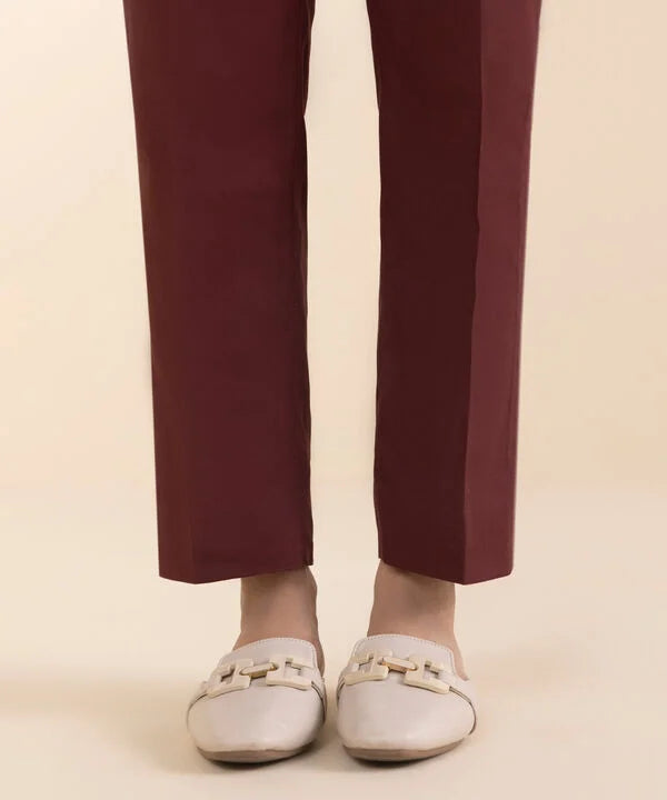 Refresh your wardrobe with our three-piece printed ensemble in maroon featuring a lawn shirt, dyed cotton trousers and a matching voile dupatta.