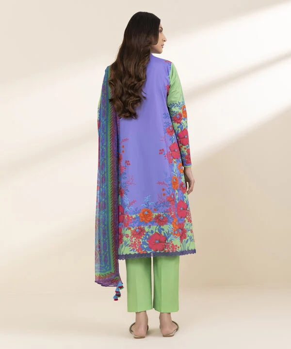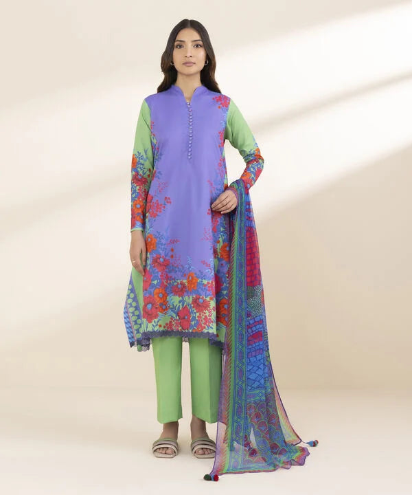 Step out in style in our printed lilac and green lawn shirt and cotton trousers ensemble with a multi-coloured blended chiffon dupatta.