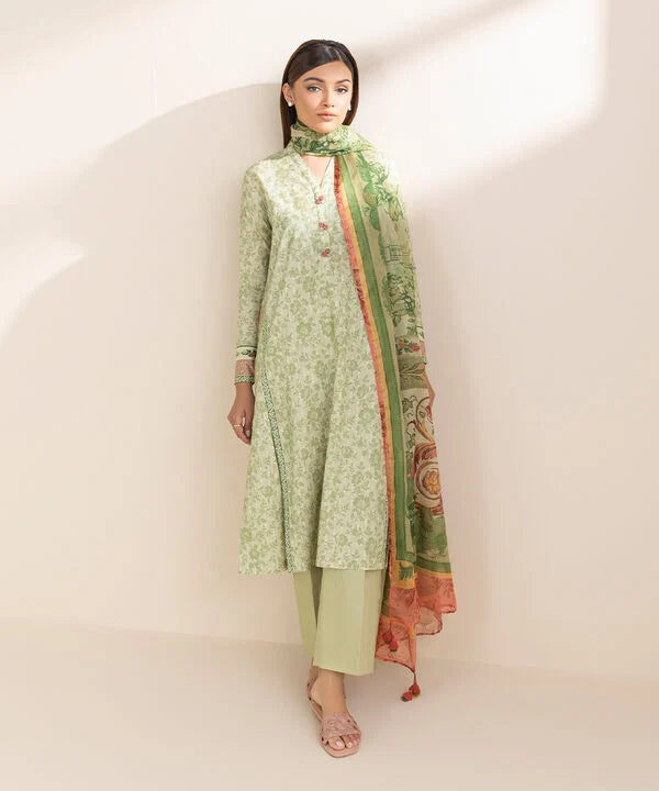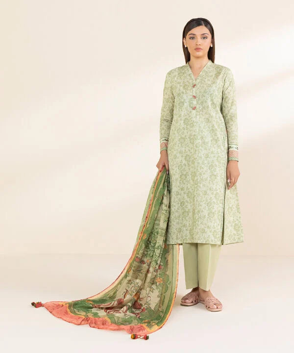 Elevate your style with our three-piece printed ensemble, featuring a pistachio green lawn shirt and cotton trousers paired with a lime green blended tissue dupatta.