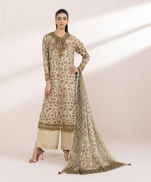 Printed With Embroidered Sequins And Lace Finish Front Panel, Printed With Embroidered Sequins And Lace Finish Back Panel, Round Neckline, Full Sleeves, Calf Length