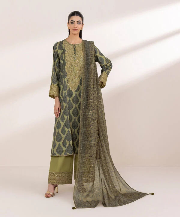 Printed With Tilla Embroidered Sequins And Lace Finish Front Panel, Printed Back Panel, Round With Slit Neckline, Full Sleeves, Calf Length