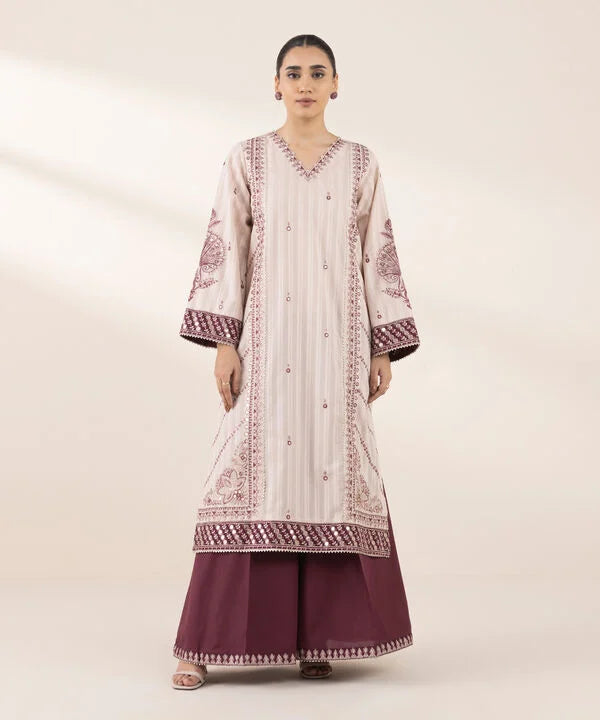 Perfect your festive style with our dyed pink, tilla embroidered A-line shirt featuring a V-neckline.