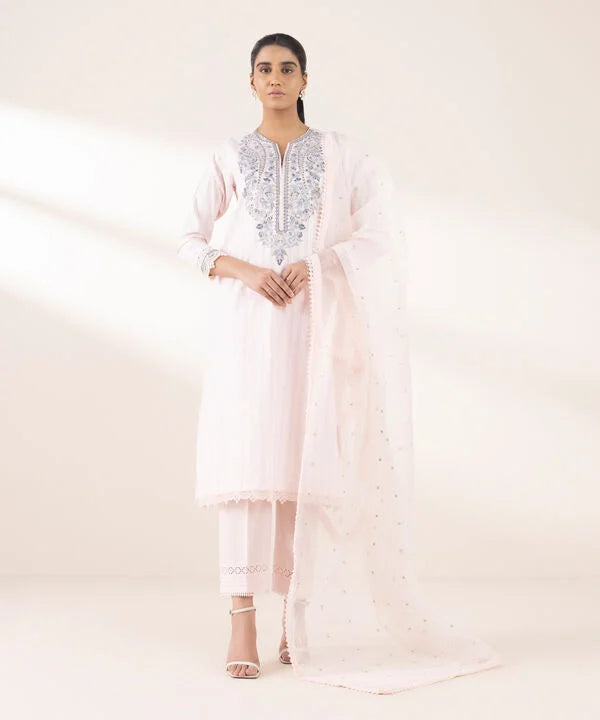Perfect your festive style with our pink dyed embroidered A-line shirt featuring a round neckline with a slit.