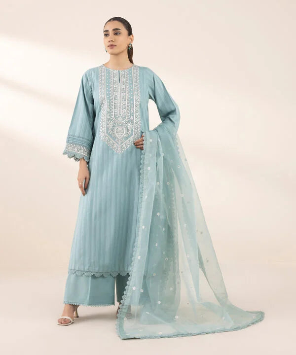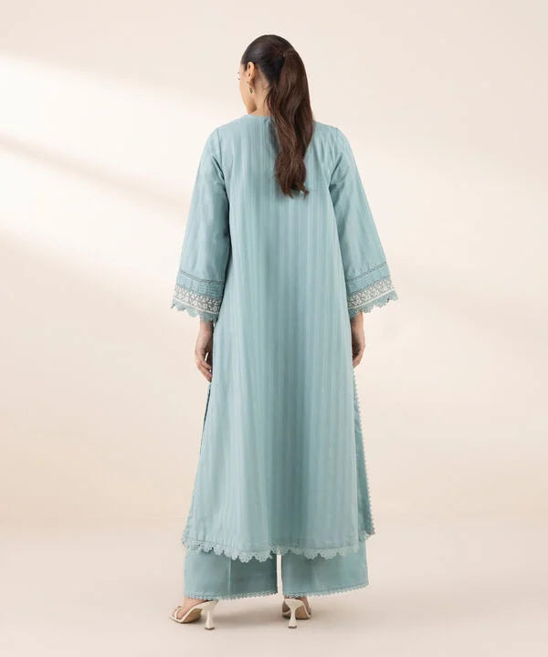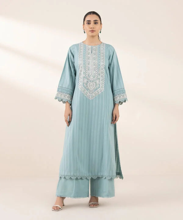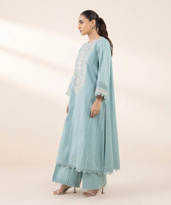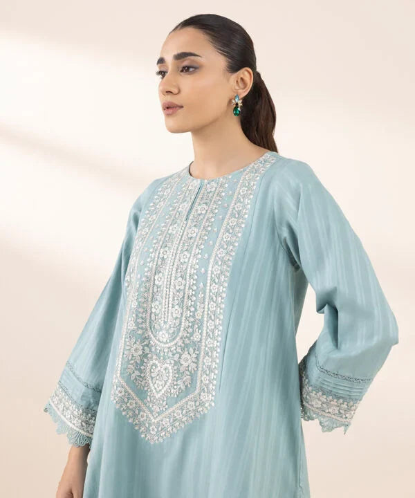 Perfect your style with our blue dyed embroidered A-line shirt featuring a round neckline with a slit.