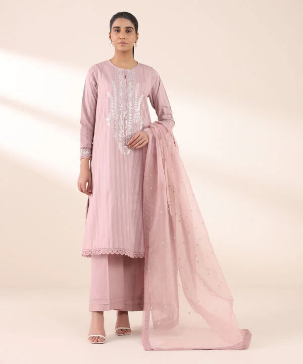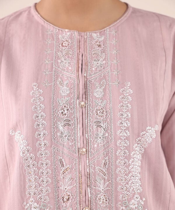 Perfect your festive style with our dyed tea pink embroidered A-line shirt featuring a round neckline with a slit.