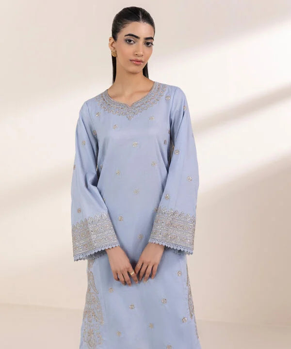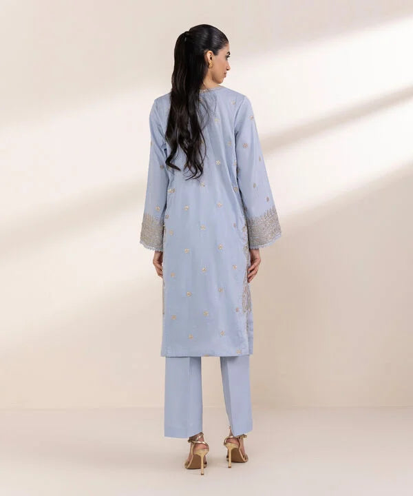 Step out in style in our embroidered blue dobby panelled A-line shirt with a round neckline and slit.