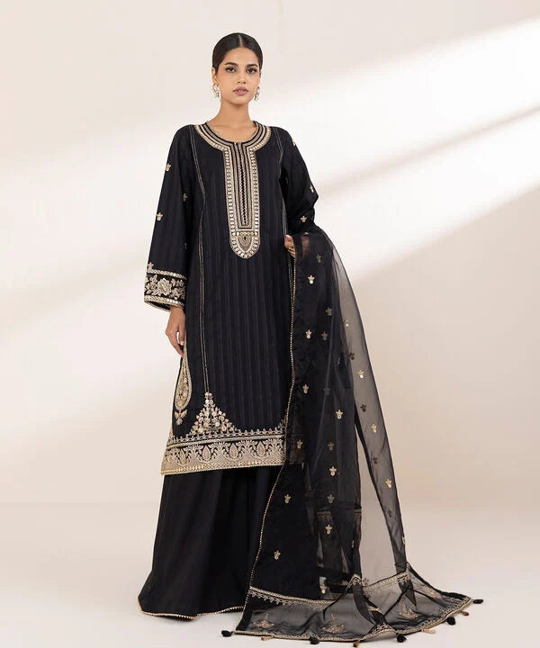 Perfect your festive style with our dyed black, tilla embroidered A-line shirt featuring a round neckline with a slit.